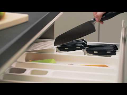 Excelente para un almacenamiento organizado de hasta nueve cuchillos de cocina con hojas cortas y largas. La bandeja se puede unir fácilmente con otras bandejas FlexiSPACE para aprovechar el espacio en los cajones de los muebles de cocina. Fabricado de excelente plástico resistente. Viene con bases antideslizantes y uniones. Garantía de 3 años. Mantén el orden en tus cajones gracias a la línea FlexiSPACE. La organización en tu cocina será perfecta.