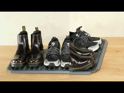 Bandeja fabricada de resistente material plástico para dejar secar el calzado mojado. El fondo perfilado drena el agua hacia los lados de la bandeja, lo que hace que el calzado se seque rápidamente. Se pueden unir fácilmente dos o más bandejas para calzado. Garantía de 3 años.