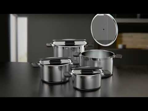 Moderna batería de cocina con exclusivas tapas de vidrio / acero inoxidable, cómodas asas de plástico resistente, fondo triple sándwich y escala de medida. Las tapas se pueden apoyar de lado de forma segura en el borde del recipiente; el vapor condensado regresa directamente hacia el interior del recipiente. Perfecto para ahorrar espacio. La batería es apilable; las tapas colocadas en los recipientes economizan significativamente el espacio de la cocina. Fabricado de acero inoxidable de alta calidad, apto para todo tipo de cocinas incluidas cocinas de inducción. Apto para lavavajillas. Garantía de 5 años.
