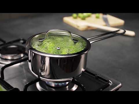 Moderna batería de cocina con tapas de vidrio / acero inoxidable, cómodas asas, fondo triple sándwich y escala de medida. Fabricado de acero inoxidable de alta calidad, apto para todo tipo de cocinas incluidas cocinas de inducción. Apto para lavavajillas. Garantía de 5 años.