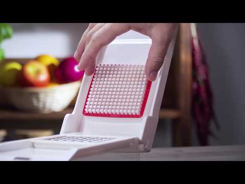 Corta fácil y rápidamente verduras y frutas frescas en cubos pequeños o grandes y en tiras. Excelente para cortar zanahorias, patatas, cebollas, perejil, pepino, remolacha, manzanas, peras, nectarinas, melocotones, etc. Provisto de un práctico utensilio para la limpieza del prensador y tratamiento antideslizante. Ambas cuchillas están fabricadas de acero inoxidable de alta calidad, las otras partes están fabricadas de sólido plástico resistente. Apto para lavavajillas. Garantía de 3 años.