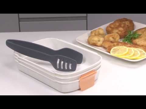 Un juego para rebozar carne, pescado, queso, champiñones y verduras fácil y rápidamente en pan rallado o rebozado. Los tres recipientes con superficie antideslizante que se unen entre sí son excelentes para rebozar los alimentos en harina y después cubrirlos con huevo batido y pan rallado. Las pinzas de nylon resistentes al calor son adecuadas para rebozar alimentos en los platos y darles la vuelta en la sartén. Provisto de una cuchilla para romper huevos fácilmente. Adecuado para frigorífico, congelador, microondas y lavavajillas. Recetas en el interior. Garantía de 3 años.