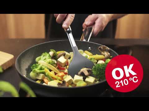 Fabricado de acero inoxidable de alta calidad y nylon resistente al calor (210 °C). Adecuado para todo tipo baterías de cocina, excelente para baterías con recubrimiento antiadherente. No dañan la superficie. Apto para lavavajillas. Garantía de 3 años.
