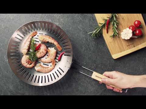 Excelente para asar fácilmente verduras, rodajas de carne, carne ahumada, pescado pequeño, castañas, setas, etc. en todas las barbacoas comunes. Con mango de diseño único, la sartén se puede utilizar también en barbacoas con la tapa puesta. Fabricado de acero inoxidable de alta calidad y madera de árbol del caucho brasileño de alta calidad. Con asa plegable y ojal para colgar, perfecto para ahorrar espacio. Garantía de 3 años.